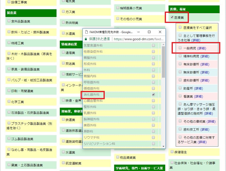 送り先のニーズにあわせた内容に絞って送信するとより効果的ですので、例えば医療業界に関する内容なら【医療業】→【一般病院】→【消化器外科】などと絞り込んで送信いただくことが出来ます。